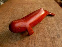 (写真左: メコン川を泳ぐ河イルカ、 写真右: お土産屋で売られている手彫りの河イルカ)