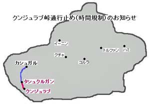 現在、カシュガル〜クンジュラブ峠公路のメンテナンスが進められていますが、1626km〜1879km区間(およそタシュクルガン〜クンジュラブ峠まで)は、仮設道路の建設が出来ないため、時間規制による全面通行止めを行っています。