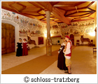 たいまつによって明るく、ロマンチックな雰囲気をかもしだしている中庭を通った後、中世の衣装を身にまとったガイドが、幻想的な雰囲気の漂う夜のトラッツベルク城に皆さまをご案内いたします。日本語を含め8ヵ国語に対応する放送劇のような迫力満点のオーディオガイドには、かつてトラッツベルク城を所有していた貴族たちが登場し、華麗な「ルネサンス部屋」、「ゴシックの居間」、壁画に描かれているハプスブルク家の家系図や大規模な兵器庫を紹介してくれます。