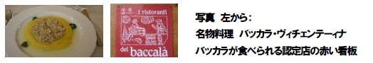 ヴィチェンツァの名物料理は、干しだらを味付けした「バッカラ・ヴィチェンテーィナ」で、ポレンタと絶妙の相性です。この伝統的なバッカラが食べられる認定店は赤い看板が目印です。