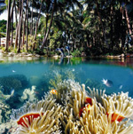 水深は一番深いところでも1m強、底には一面珊瑚が生息し、サメやエイ等を含む80種の海洋生物が悠然と泳ぐ。。。