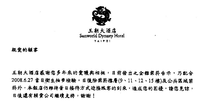 台湾最大級の大型ホテル「王朝大飯店」(サンワールド・ダイナスティーホテル)が先般発表いたしました「全館禁煙」の通達に誤りがございましたので、下記にお知らせいたします。