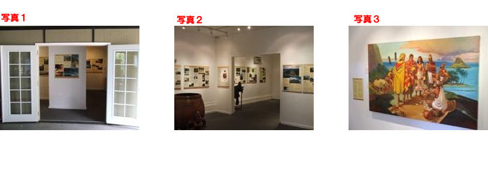 パネル写真の展示では、500万坪の敷地内にある3つのハワイ先住民族の生活共同体「アフプアア」(クアロア、ハキプウ、カアアヴァ)の歴史の解説から始まり、800年前にポリネシア人によって造られたモリイ養魚池での狩猟方法をわかりやすく説明しています。