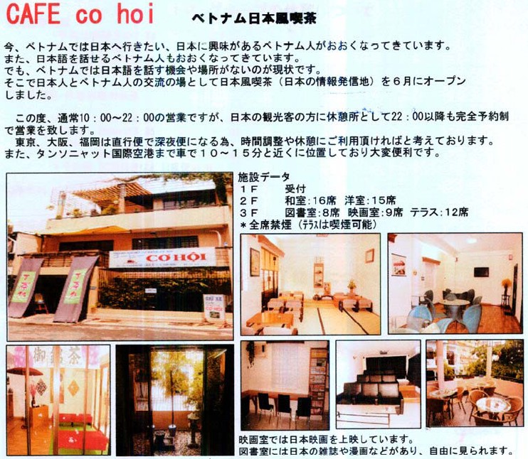 ホーチミン空港から車で10〜15分ほどの場所に、日本風の喫茶店「カフェ・コー・ホイ」がオープンいたしました。帰国の際、空港へ向うまでに時間の余裕がある場合、ご利用になられてはいかがでしょう?