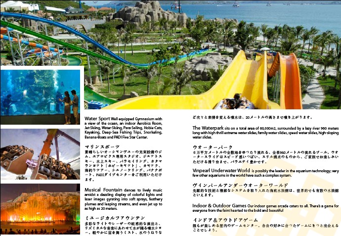 プライベートビーチ、ベトナム国内最大の3つのプール、水族館、ゲームセンター、遊園地、マリンスポーツ、噴水ショー、ショッピングモール、フードヴィレッジ、映画館等、時間を気にする事なく、夜まで思いっきり遊んでみてはいかがでしょうか?