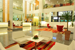 空港からは車で約20分、モダンな内・外装の同ホテルは全325室の4ツ星ホテルで、2009年9月頃にはスパも新設オープンの予定です。