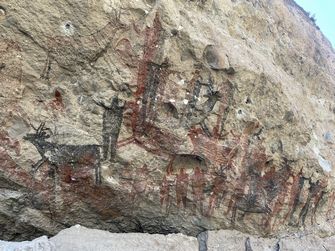 この岩絵群には人物だけでなく、狩猟道具や動物、さらには巨人や海洋生物まで描かれています。