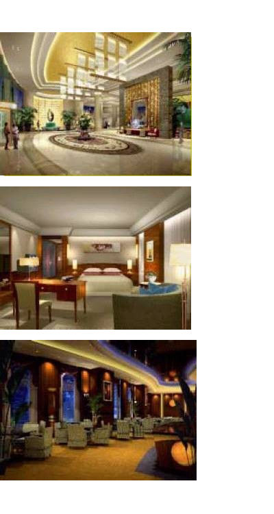 (写真上: ロビー、 写真中: 客室、 写真下: レストラン)