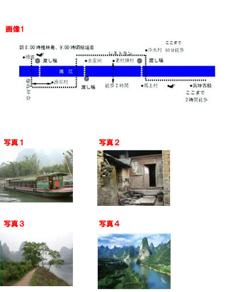 途中、3回漓江を渡り、浪石村、全家洲村、老村頭村、冷水村、馬上村、楊家村、小河背山村、大河背村を経て、九馬画山、黄布倒影、朝板山などの美しい景色を眺める事が出来ます。