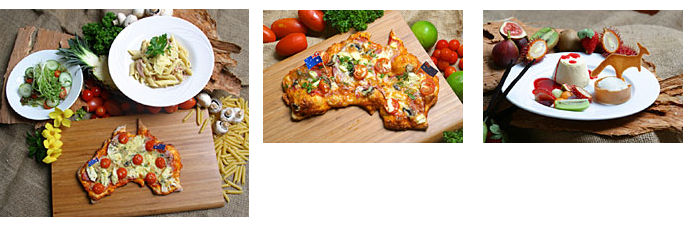 「モンスーンズ」の人気料理はなんと行っても石釜で焼いたピッツァなので、もちろんコースのメインはピッツァ。その人気石釜焼きピッツァをオーストラリアの国型にアレンジして『丸かじりオーストラリア』をその名の通り実現いたしました。