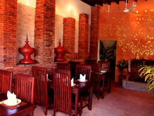赤レンガの質感と、古風なオブジェに囲まれた空間は、まるでチェディ(仏塔)の内部に居るような荘厳な雰囲気を与えてくれます。