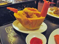 料理はその名の通り「宮廷風料理」が自慢で、料理は、細かく彫刻された野菜や果物で飾られたもので、品数が多くボリュームも味も満点。宮廷料理の夕べ(衣装と音楽付き)も行う事が可能です。この他にも通常のベトナム料理も提供しています。